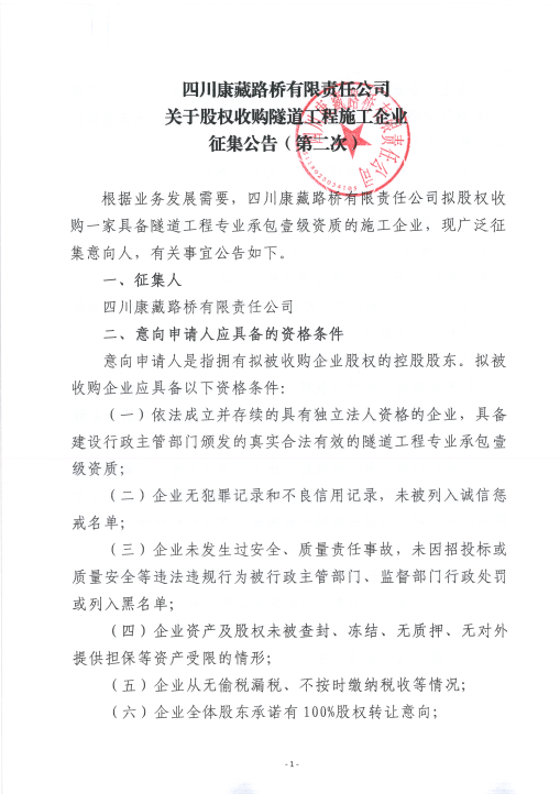 四川康藏路橋有限責(zé)任公司關(guān)于股權(quán)收購隧道工程施工企業(yè)征集公告(第二次)