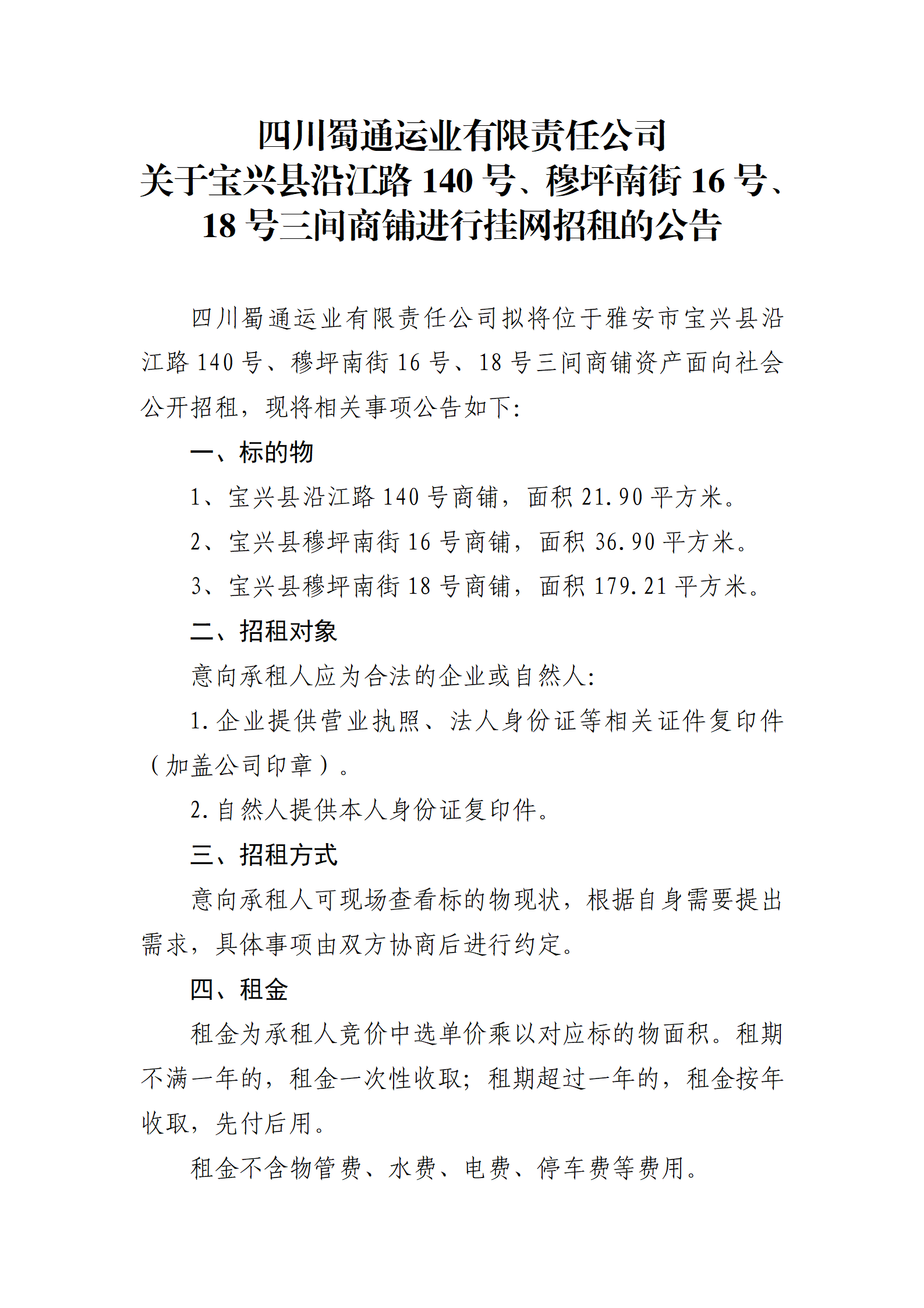 四川蜀通運業(yè)有限責(zé)任公司 關(guān)于寶興縣沿江路140號、穆坪南街16號、18號三間商鋪進行掛網(wǎng)招租的公告