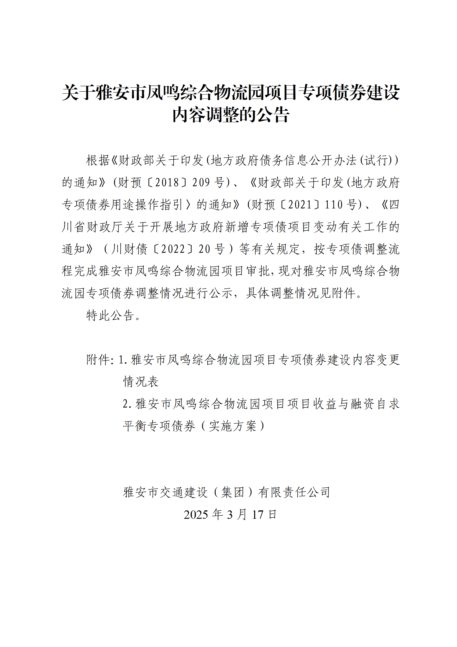 關(guān)于雅安市鳳鳴綜合物流園項目專項債券建設(shè)內(nèi)容調(diào)整的公告