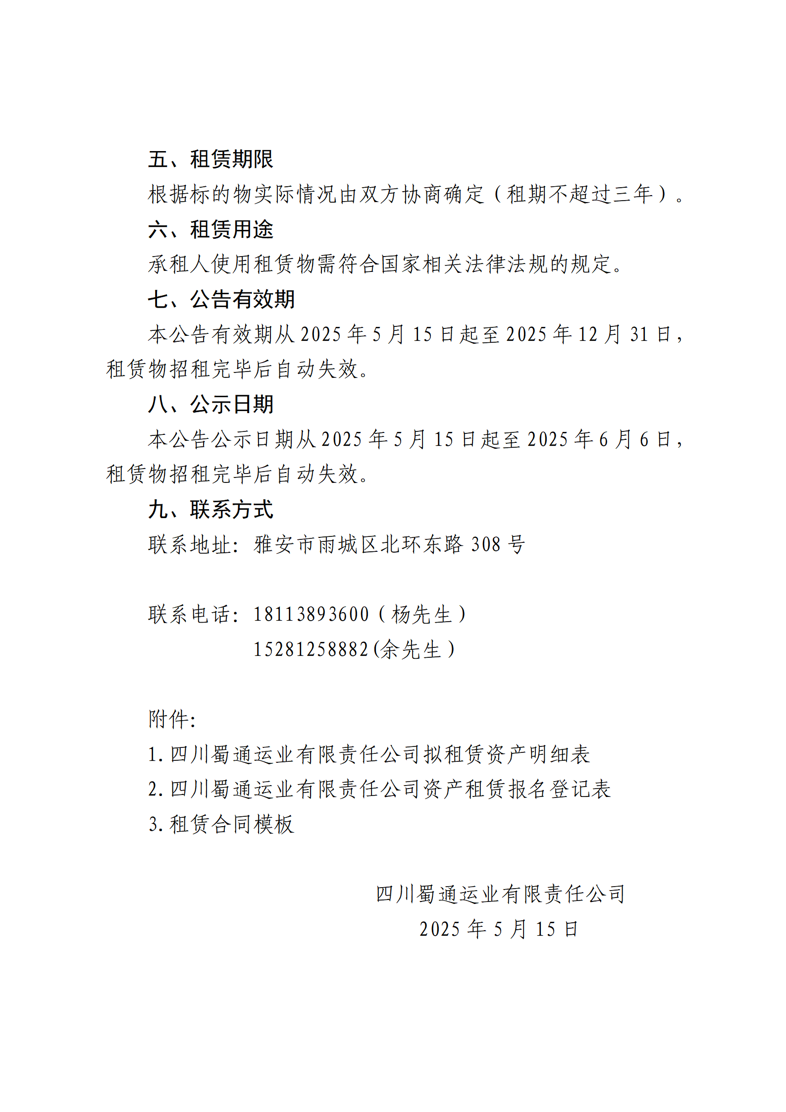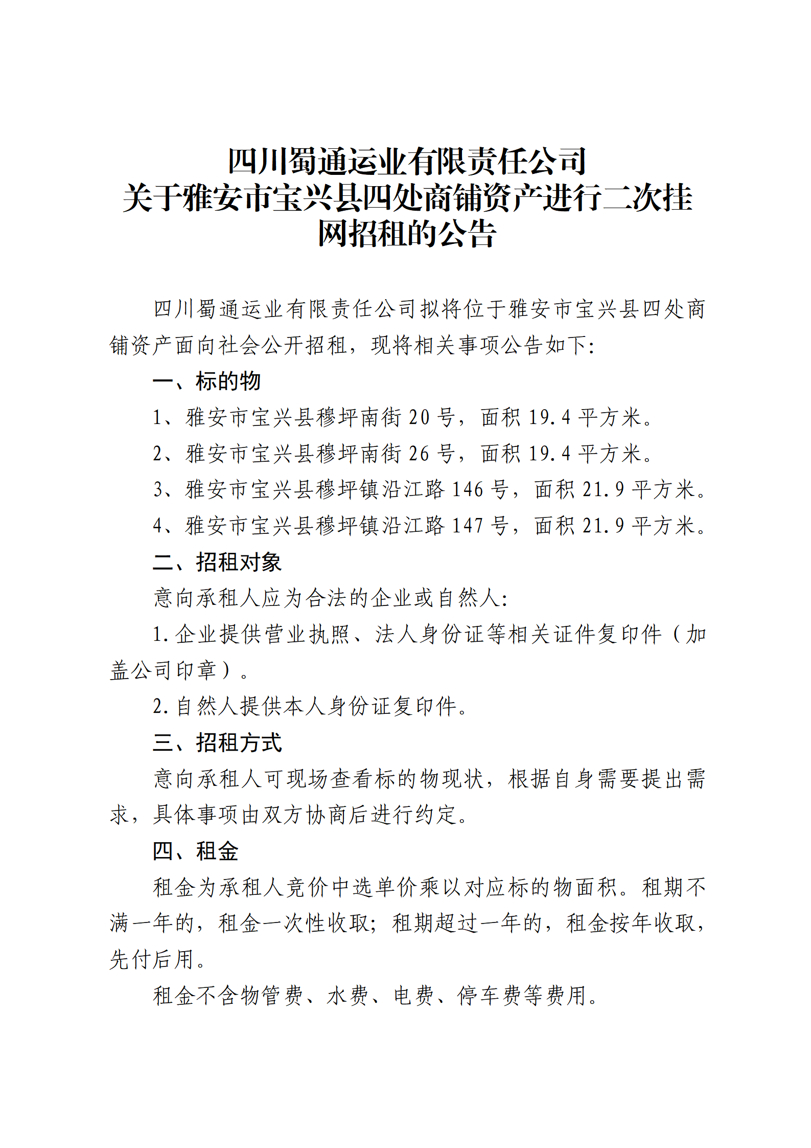 四川蜀通運業(yè)有限責任公司 關于雅安市寶興縣四處商鋪資產(chǎn)進行二次掛網(wǎng)招租的公告
