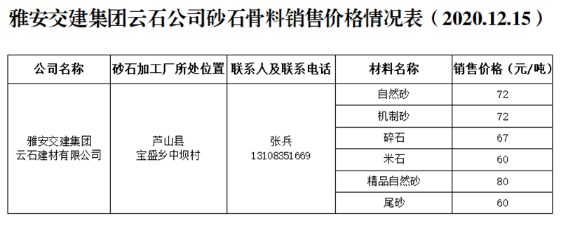 ÑŰ²½»½¨¼¯ˆF(tu¨¢n)ÔÆÊ¯¹«Ë¾É°Ê¯¹ÇÁÏäNÊÛƒr(ji¨¤)¸ñÇé›r±í£¨2020.12.15£©