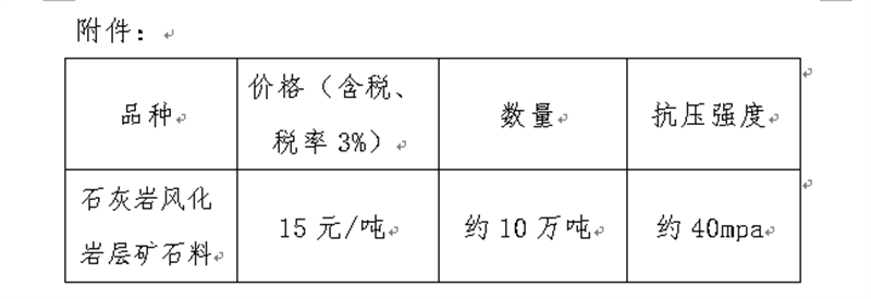 現(xiàn)將我公司礦山首采平臺的石灰?guī)r風化巖層礦石料定價出售事宜進行公示(見附件),經(jīng)公司研究決定,定價出售風化巖層礦石料約10萬噸,現(xiàn)通過集團公司官網(wǎng)信息公示后對外銷售。報名客戶數(shù)不限,銷售方式為先款后貨,簽約銷售,銷售時間以礦山開采和生產(chǎn)計劃為準。