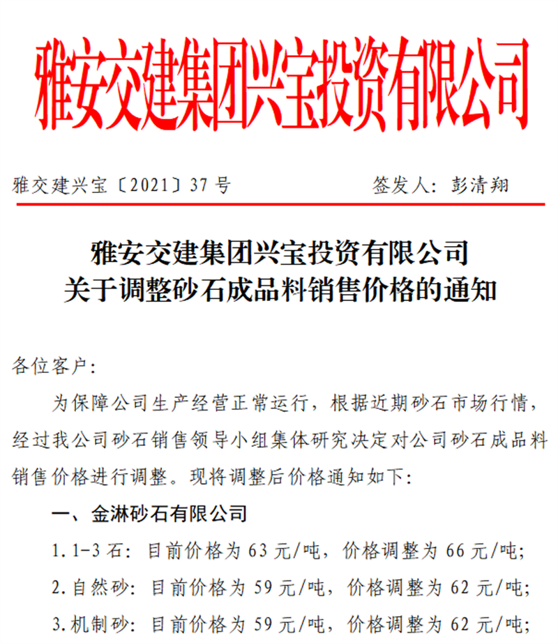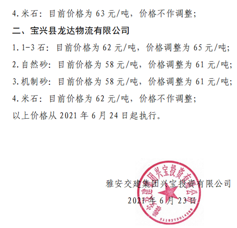 雅安交建集團(tuán)興寶公司砂石骨料銷(xiāo)售價(jià)格情況表(2021.6.23)