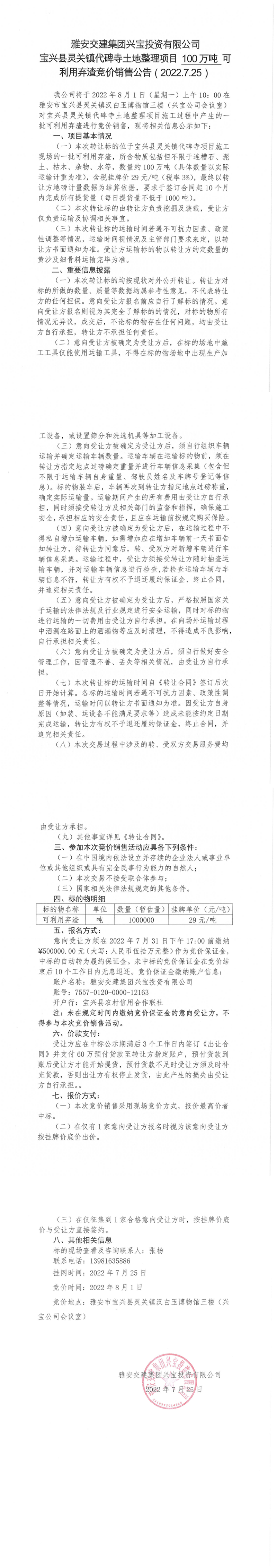 雅安交建集團(tuán)興寶投資有限公司寶興縣靈關(guān)鎮(zhèn)代碑寺土地整理項(xiàng)目100萬噸可利用棄渣競價(jià)銷售公告(2022.7.25)