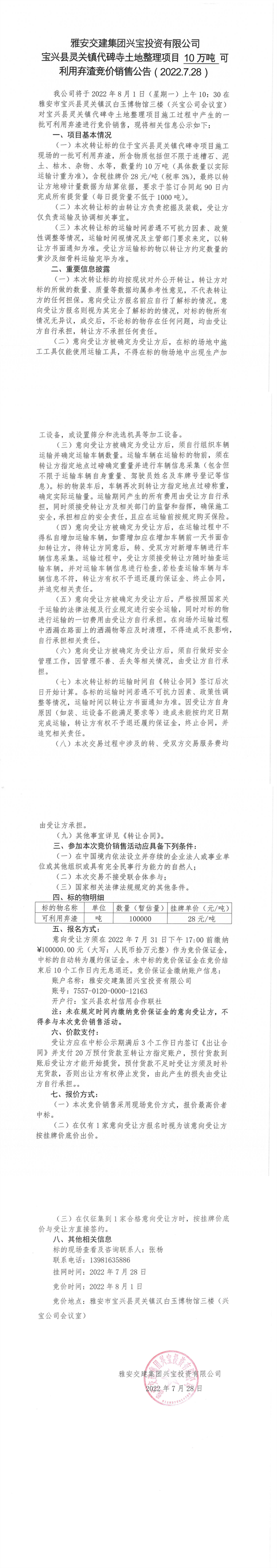 雅安交建集團興寶投資有限公司靈關(guān)鎮(zhèn)代碑寺土地整理項目5萬噸可利用棄渣競價銷售公告(2022.7.28)