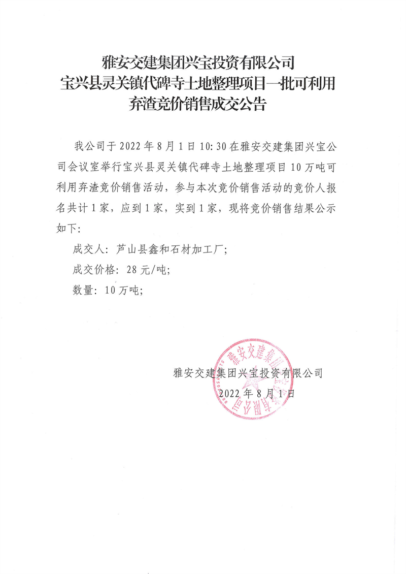 雅安交建集團(tuán)興寶投資有限公司靈關(guān)鎮(zhèn)代碑寺土地整理項(xiàng)目10萬(wàn)噸可利用棄渣競(jìng)價(jià)銷售成交公告(2022.8.1)