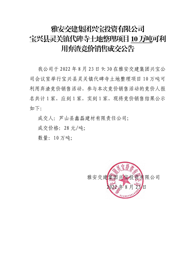 雅安交建集團興寶投資有限公司寶興縣靈關(guān)鎮(zhèn)代碑寺土地整理項目10萬噸可利用棄渣競價銷售成交公告(8.23)