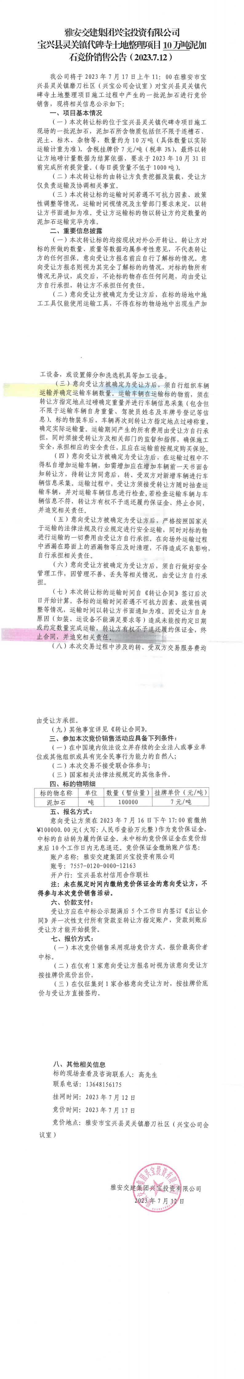 雅安交建集團興寶投資有限公司寶興縣靈關鎮(zhèn)代碑寺土地整理項目10萬噸泥加石競價銷售公告(2023.7.12)