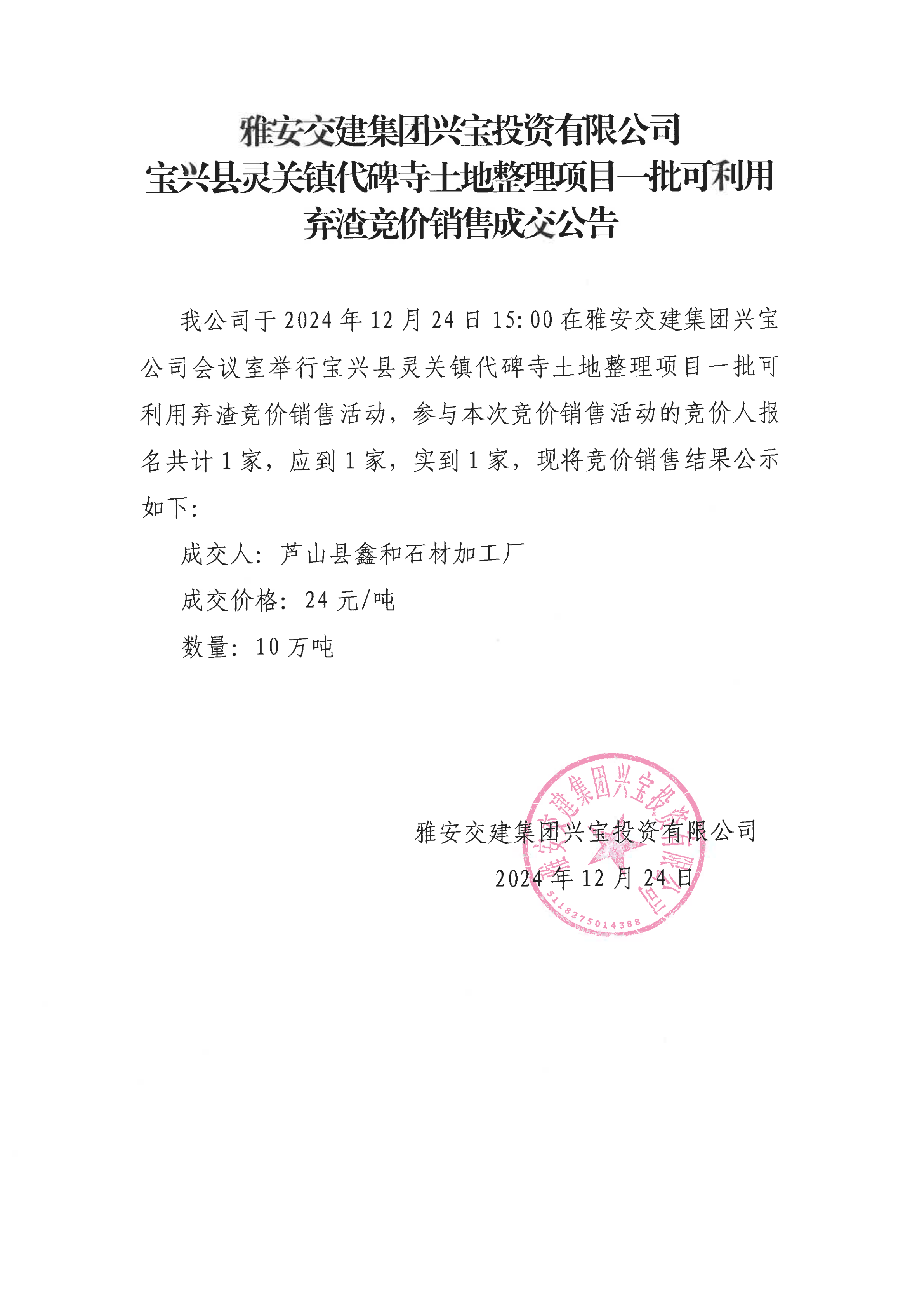 雅安交建集團(tuán)興寶投資有限公司靈關(guān)鎮(zhèn)代碑寺土地整理項(xiàng)目10萬噸可利用棄渣成交公告(2024.12.24)